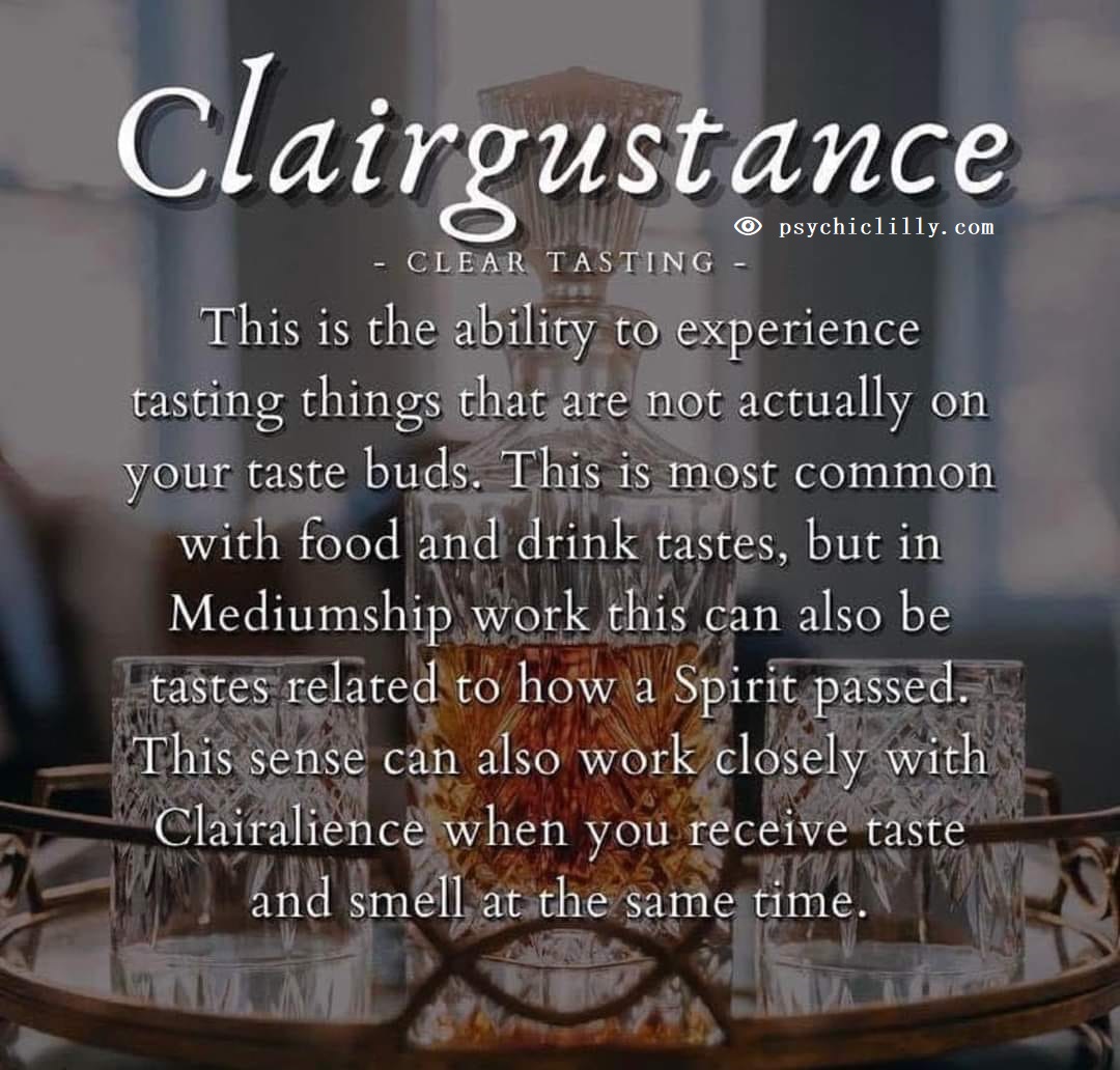 The eight clair senses are types of psychic abilities that correspond with the senses of seeing, hearing, feeling, smelling and tasting. When you tap into your own personal intuition and spirit energy, your mind and body become filled with clarity and mental impressions: thoughts, feelings, images, sounds, tastes and smells.